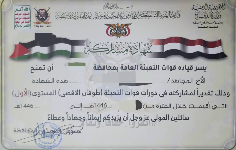 وأكدت المصادر بحسب ما نقله الصحفي فارس الحميري أن الميليشيات منحت شهادات للمشاركين، ووعدت بإدراج من التحقوا بهذه الدورات ضمن قوائم وزارة الدفاع، فيما بدأت فعليًا بأخذ البصمات والصور للمتدربين تمهيدًا لاستخراج بطائق عسكرية، وهو ما يعكس رغبة الجماعة في دمج المدنيين في هياكلها العسكرية وخلق قاعدة اجتماعية ملزمة بخدمة أجندتها القتالية.