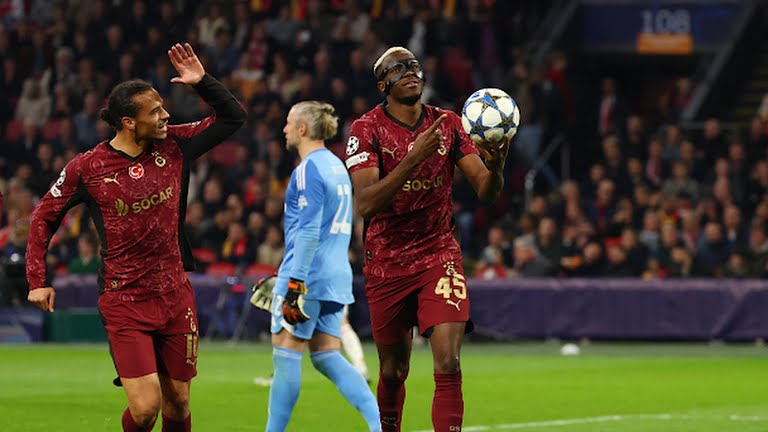وسجّل النيجيري فيكتور أوسيمين ثلاثة أهداف "هاتريك"، ليقود فريقه غلطة سراي التركي لفوز عريض على مضيفه آياكس أمستردام الهولندي (3-0).