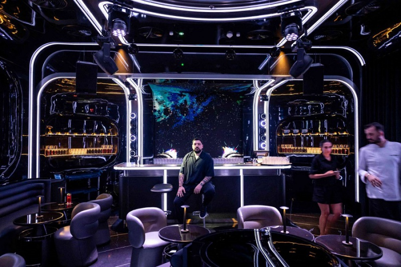 منذ اللحظات الأولى لدخول المطعم، يجد الزائر نفسه داخل مشهد يبدو مقتبساً من فيلم خيال علمي؛ هولوغرام ضخم لشاب أشقر يُدعى "أيمن" يرحّب بالزوار، قبل الانتقال إلى ممر مظلم تُضيئه خطوط نيون لامعة، وصولاً إلى قاعة يتوسطها هيكل معدني أسطواني يطلق عوالم افتراضية تتراقص على الجدران أثناء تناول الطعام.