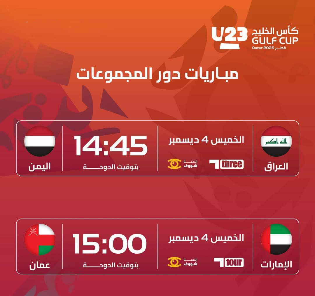 وتجمع المباراة الافتتاحية منتخبي اليمن والعراق عند الساعة الثانية و45 دقيقة ظهرًا بتوقيت اليمن، على ملعب "أسباير زون 2" في العاصمة القطرية الدوحة. وضمن المجموعة ذاتها، تلتقي الإمارات وعُمان عند الساعة الثالثة عصرًا.