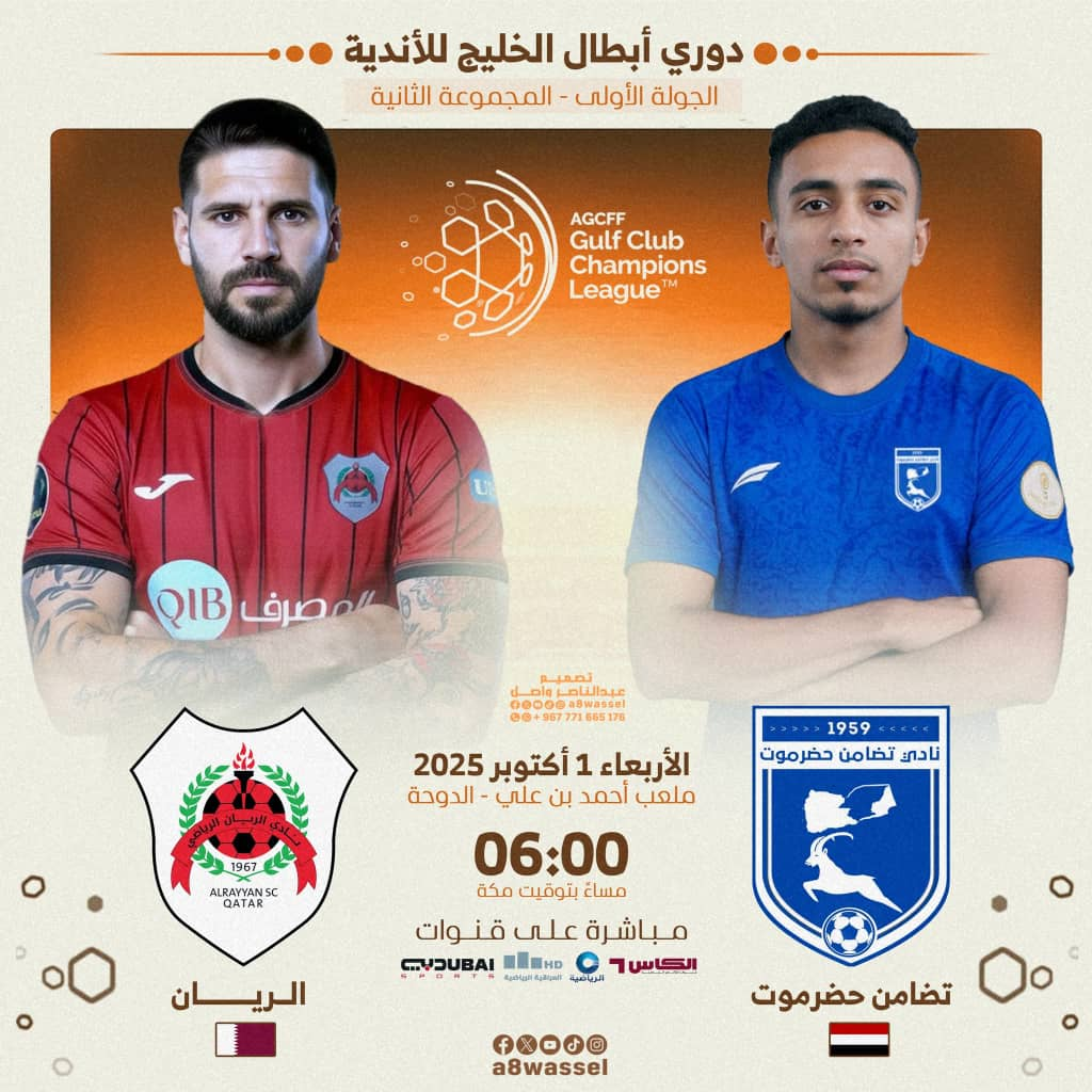 يواجه نادي تضامن حضرموت، ممثل اليمن في بطولة دوري أبطال الخليج للأندية 2025–2026م لكرة القدم، اليوم الأربعاء، نادي الريان القطري، وذلك ضمن الجولة الخامسة من دور المجموعات، على استاد سعود بن عبدالرحمن بنادي الوكرة، في العاصمة القطرية الدوحة.