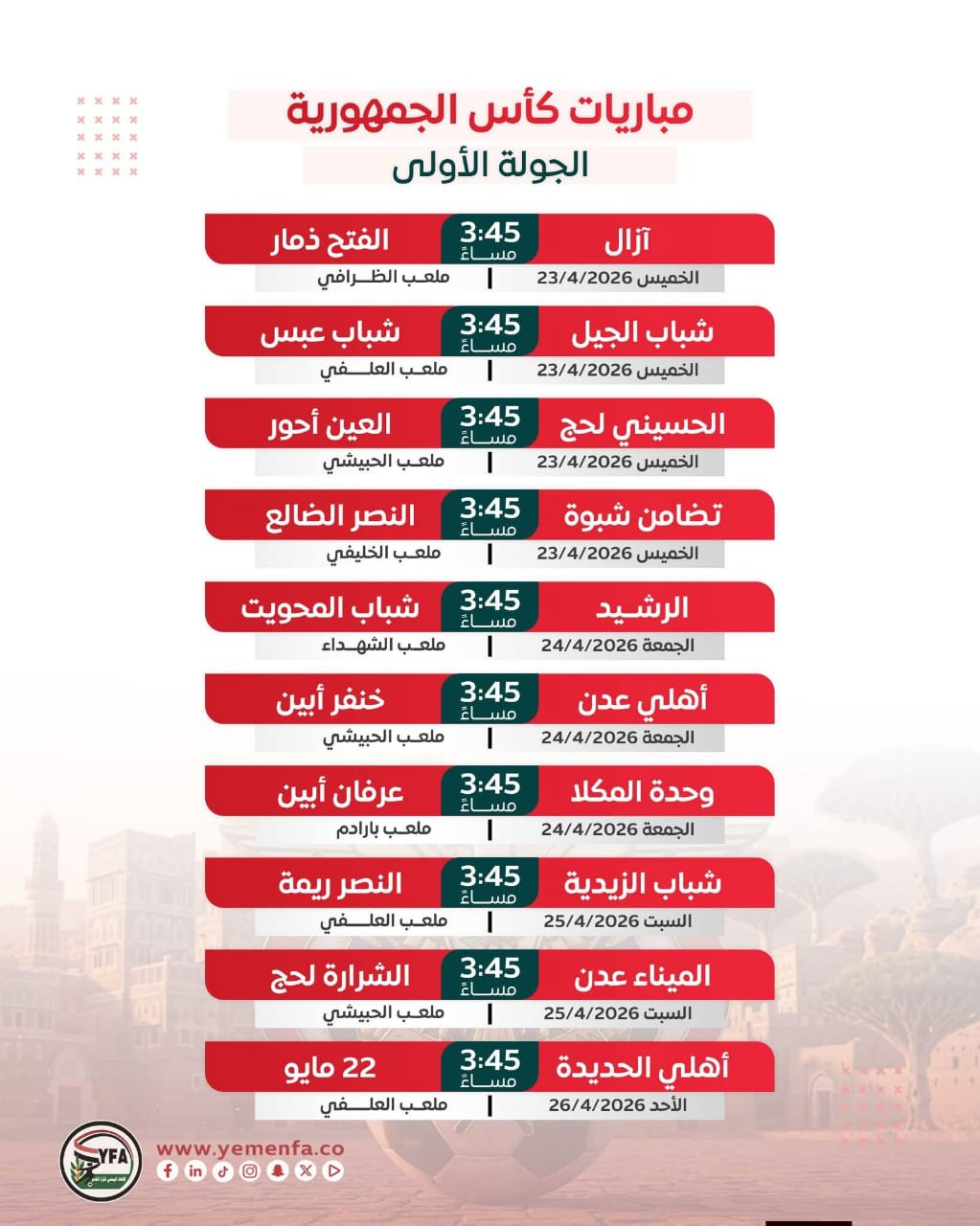 أهلي الحديدة × 22 مايو ملعب العلفي الأحد 26 أبريل 3:45 مساءً