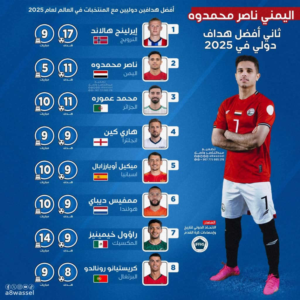 اليمني ناصر محمدوه وصيفًا لهدافي المنتخبات في 2025 خلف هالاند ويتفوق على نجوم العالم