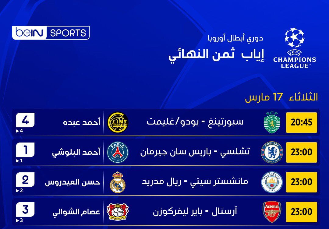 ويتطلع آرسنال الإنجليزي إلى مواصلة مشواره في دوري أبطال أوروبا، عندما يستضيف باير ليفركوزن الألماني، بعدما انتهت مباراة الذهاب بين الفريقين بالتعادل 1–1 في ألمانيا. ويتسلح آرسنال بعاملي الأرض والجمهور من أجل متابعة طريقه في البطولة، في وقت يواصل فيه تصدره ترتيب الدوري الإنجليزي.